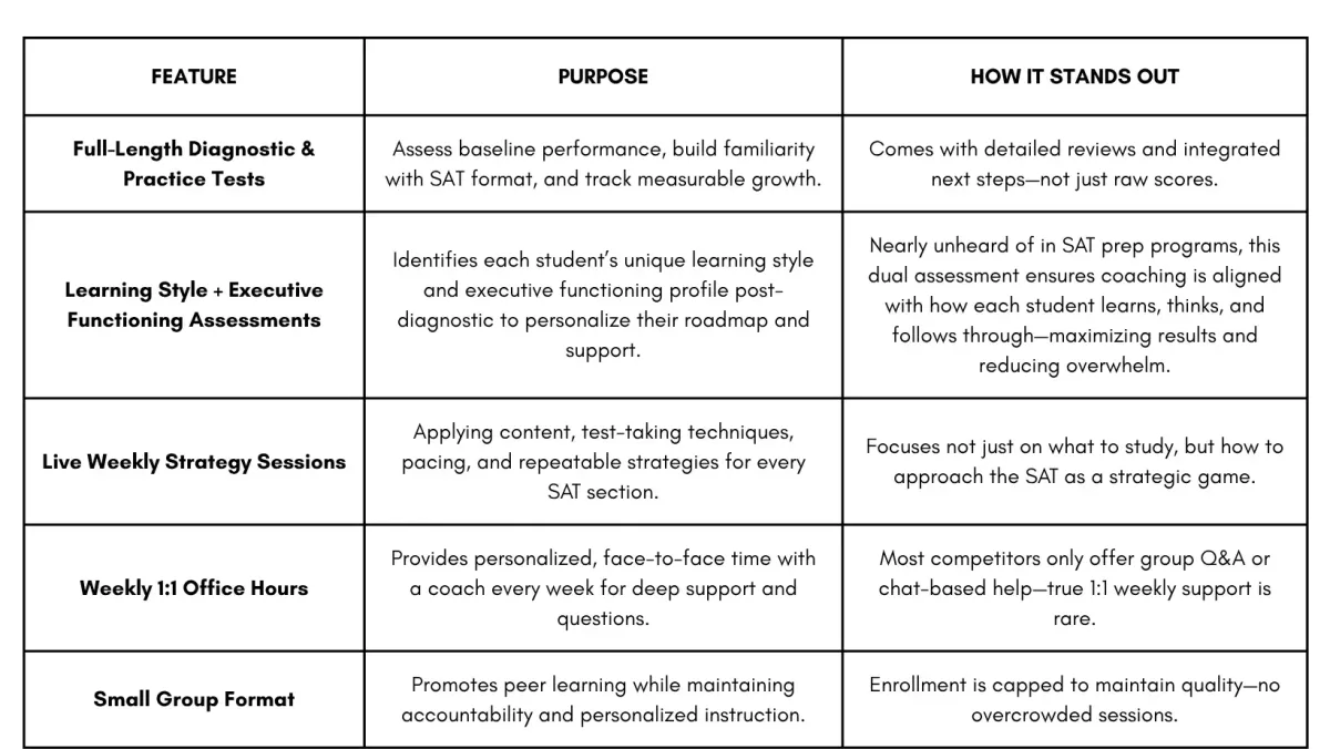 Join a small group cohort with live coaching and expert feedback. Combines the full SAT system with community, accountability, and direct support for maximum results.
